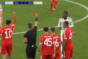 歐冠1/4決賽次回合,拜仁vs皇馬,第86分鐘,替補(bǔ)登場(chǎng)的卡馬文加兩黃變一紅被罰下。卡馬文加被罰下后拜仁連入兩球,總比分6-4淘汰皇馬。