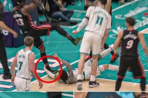 上半場,黃蜂主將拉梅洛·鮑爾用手扒了熱火球星阿德巴約腳后跟致其倒地受傷,后者返回更衣室,本場回歸成疑!