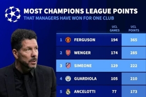 執(zhí)教單一俱樂(lè)部歐冠拿分榜:(淘汰賽勝利計(jì)為3分)