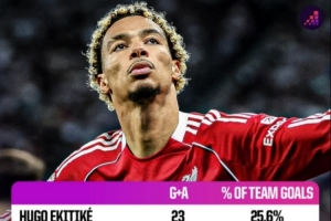 體育資訊4月15日訊 埃基蒂克疑似跟腱受傷將長期缺戰(zhàn),這對利物浦攻擊力無疑是巨大打擊。OPTA盤點(diǎn)了本賽季利物浦隊(duì)內(nèi)各項(xiàng)賽事參與進(jìn)球(進(jìn)球+助攻)情況,具體如下(參與進(jìn)球+隊(duì)內(nèi)占比)