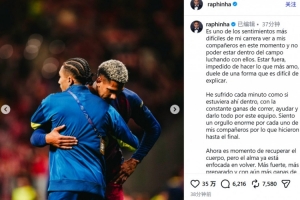 體育資訊4月15日訊 巴薩在本輪歐冠八強(qiáng)戰(zhàn)主場(chǎng)0-2、客場(chǎng)2-1,總比分2-3被馬競(jìng)淘汰,期間有多次爭(zhēng)議判罰引發(fā)巴薩球員不滿。在國(guó)家隊(duì)友誼賽受傷而因傷缺陣的拉菲尼亞賽后通過社媒發(fā)文: