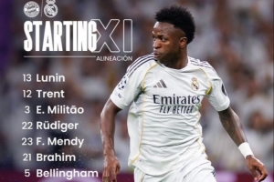 皇馬首發(fā):13-盧寧、12-阿諾德、3-米利唐、22-呂迪格、23-費(fèi)蘭·門迪、21-布拉欣·迪亞斯、5-貝林厄姆、8-巴爾韋德、15-居萊爾、10-姆巴佩、7-維尼修斯