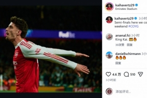 阿森納球員哈弗茨社媒曬出慶祝的照片,配文:“半決賽我們來了,迎接一個重要的周末?!?/p>