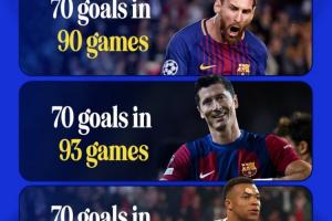 CBS體育曬圖,統(tǒng)計(jì)球員打進(jìn)歐冠70球時(shí)所用的場(chǎng)次。其中梅西90場(chǎng)70球歷史最快,萊萬(wàn)93場(chǎng)70球第二,姆巴佩98場(chǎng)70球第三。