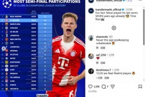 根據(jù)德轉(zhuǎn)的數(shù)據(jù)統(tǒng)計(jì),這是拜仁歷史上第14次挺進(jìn)歐冠四強(qiáng),排在第二位,僅次于17次進(jìn)入四強(qiáng)的皇馬。