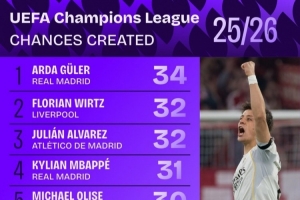 本賽季歐冠創(chuàng)造機(jī)會排名: