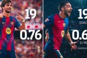 巴薩官方也曬出數(shù)據(jù)對比照,表示費蘭本賽季已打進(jìn)19球,追平他個人上賽季的總進(jìn)球數(shù)。與此同時,費蘭的每90分鐘進(jìn)球數(shù)也從上賽季的0.64球升至本賽季的0.76球。