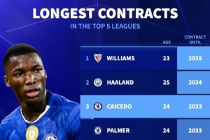 體育資訊4月17日訊 切爾西已經(jīng)官宣同凱塞多續(xù)約至2033年,《轉(zhuǎn)會市場》統(tǒng)計顯示他也并列當前合同最長球員第三位。