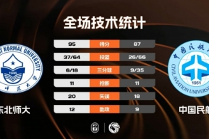末節(jié)比賽,中國民航先拿5分縮小分差,東北師大及時調(diào)整給出回應(yīng),僵持半節(jié)之后中國民航的外線突然投開,連續(xù)命中三分球后分差僅剩3分,關(guān)鍵時刻閆思愷也是強投三分命中幾乎殺死了中國民航逆轉(zhuǎn)的希望,最終東北師大力克中國民航成功晉級。