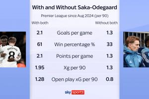 天空體育數(shù)據(jù)統(tǒng)計顯示,自2024年8月以來,當(dāng)薩卡和厄德高同時出戰(zhàn)時,阿森納英超場均打進(jìn)2.1球、勝率61%、場均2.1分、預(yù)期進(jìn)球值1.95、運動戰(zhàn)預(yù)期進(jìn)球值1.28。