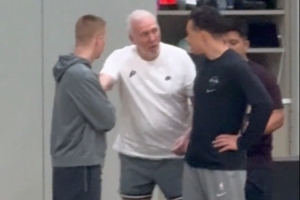 今日,馬刺傳奇教練波波維奇現(xiàn)身球隊訓練場,并在場上指導現(xiàn)任主帥米奇。