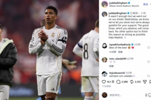 體育資訊4月18日訊 本輪歐冠八強(qiáng)戰(zhàn)次回合,皇馬在客場3-4被拜仁雙殺。中場貝林厄姆在賽后通過社媒發(fā)文。