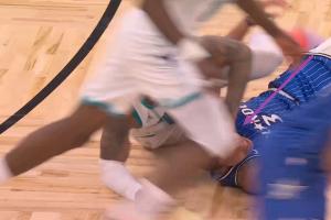GIF-小橋跟貝恩倒地了,小橋有鎖喉和按人的動作,被吹技術(shù)犯規(guī)!