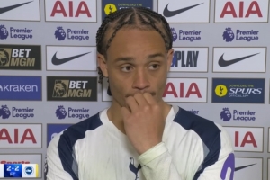 體育資訊4月19日訊 熱刺在本輪英超2-2遭布萊頓絕平,取得進球的哈維·西蒙斯在賽后接受采訪被問及相關(guān)話題。