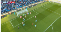 曼城角球機(jī)會(huì),胡桑諾夫打門被封堵哈蘭德再射中柱!