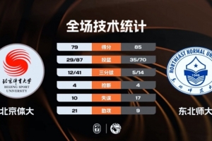 東北師大:范智博21分5板、羅俊翔17分10板、王玖豪14分5板、徐鳴陽9分13板、魏赫一9分9板、彭賀程7分、閆思愷8分