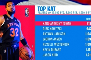 唐斯在生涯第718場(chǎng)達(dá)成,比此前用時(shí)最短的諾維茨基少了229場(chǎng)!