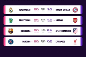 Opta超算預(yù)測歐冠1/4決賽首回合: