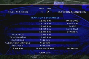 體育資訊4月8日訊 在歐冠淘汰賽首回合,拜仁2-1擊敗皇馬。以下為雙方球員本場比賽跑動數(shù)據(jù)前列的球員。