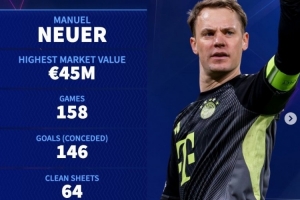 德轉(zhuǎn)也列出了諾伊爾(巔峰身價4500萬歐元)歐冠生涯關(guān)鍵數(shù)據(jù):出戰(zhàn)158場,丟146球,完成64次零封,平均每93分鐘丟1球。