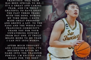 王俊杰寫道:“首先,我想感謝舊金山大學的教練和隊友們。這支球隊對我來說意義非凡,這是一個充滿關懷的偉大團隊。我非常感激過去三年能夠與多恩隊共度時光。在這里的日子里,我取得了很大的進步,也成長了許多。對于球迷和整個舊金山社區(qū),從第一天起你們就給予了我堅定不移的支持,這對我來說意義重大,難以言表。