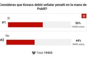 截至目前有19433人參與投票,56%的人認為普比爾手球該被判點球,44%的人認為不是點球。