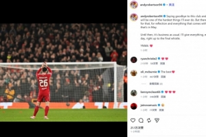 羅伯遜曬出自己向安菲爾德的謝場照,并表示:“告別這家俱樂部和球迷們將是我人生中最艱難的決定之一。但此后將會(huì)有那么一個(gè)時(shí)刻,讓我好好回顧并感受一切——那就是五月份?!?/p>