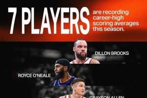 體育資訊4月12日訊 太陽官方社媒更新動態(tài),曬出了本賽季隊中7位球員創(chuàng)造了職業(yè)生涯場均得分新高的海報。