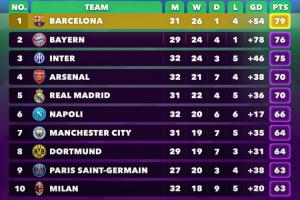體育資訊04月13日訊 歐洲五大聯(lián)賽已經(jīng)進(jìn)入最后沖刺階段,Score90統(tǒng)計(jì)了五大聯(lián)賽合并的積分榜,表格從左至右分別為比賽場數(shù)、勝、平、負(fù)、凈勝球以及積分。巴薩以79分位居第一,拜仁第二,國米第三,阿森納第四。