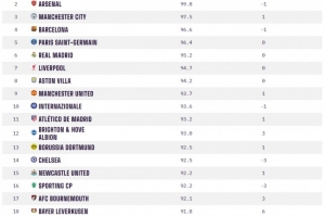 體育資訊4月13日訊 著名數(shù)據(jù)機(jī)構(gòu)OPTA對全球超過10000家俱樂部打造了一個評分系統(tǒng),評分范圍從0到100。其中,0分代表全球最弱的球隊,而100分則代表全球最強(qiáng)的球隊。在OPTA全球俱樂部實力榜中,拜仁、阿森納、曼城、巴薩以及巴黎圣日耳曼位居前五。