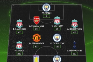 中場:薩拉赫(利物浦,210球)、B費(曼聯(lián),137球)、德布勞內(nèi)(曼城,122球)、孫興慜(熱刺,137球)