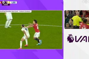 體育資訊04月14日訊 英超第32輪,曼聯(lián)對(duì)陣?yán)澛?lián)。55分鐘, VAR介入,主裁親自觀看回放,判罰利桑德羅拉拽勒溫頭發(fā),將其紅牌罰下。